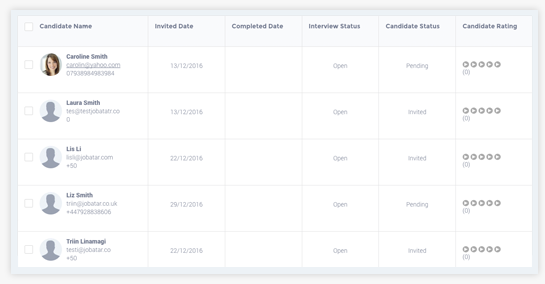 You can schedule live interviews with candidates on True Interviews platform. Say goodbye to Skype and start using fully branded interface and manage all your candidates from one platform. Send personalised emails, reschedule the interview times and rate candidates after the interview. No software to download, just click the link and you are live.